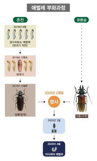 국립문화재연구소는 지난해 8월 춘천에서 찾아 인공 증식한 장수하늘소 암컷 중 한 마리가 처음으로 광릉숲 수컷과 짝짓기해 산란과 부화를 마쳤다고 13일 밝혔다.