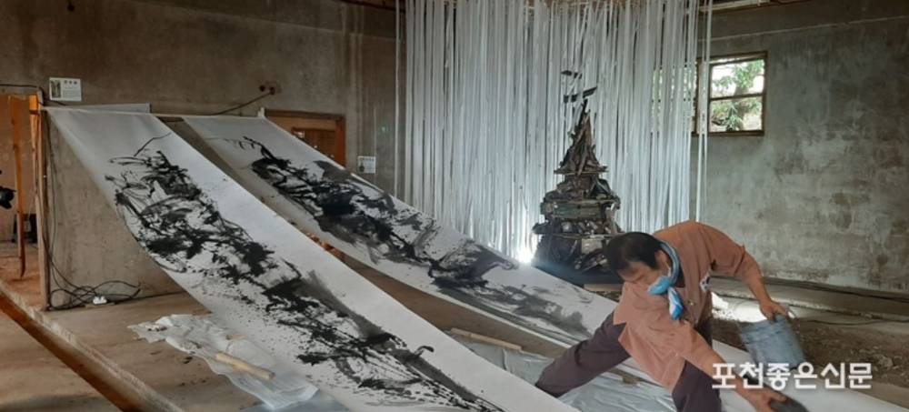 이날 전시회 오프닝 행사로 권용섭 화가는 10여 미터 길이의 흰 천 두개의 화폭ㅇ 15분동안 먹으로 산정호수 절경을 속사로 그리는 수묵화 퍼포먼스를 펼쳐 관람객들의 박수를 받았다.