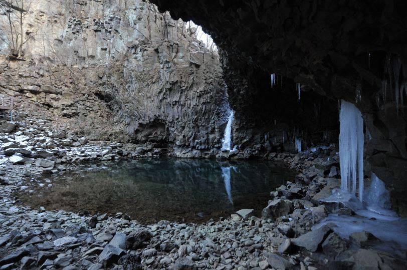 한탄강 세계지질공원 내 위치한 비둘기낭폭포. 움푹 팬 지형이 비둘기 둥지를 닮아 붙여진 이름이다. /포천시 제공