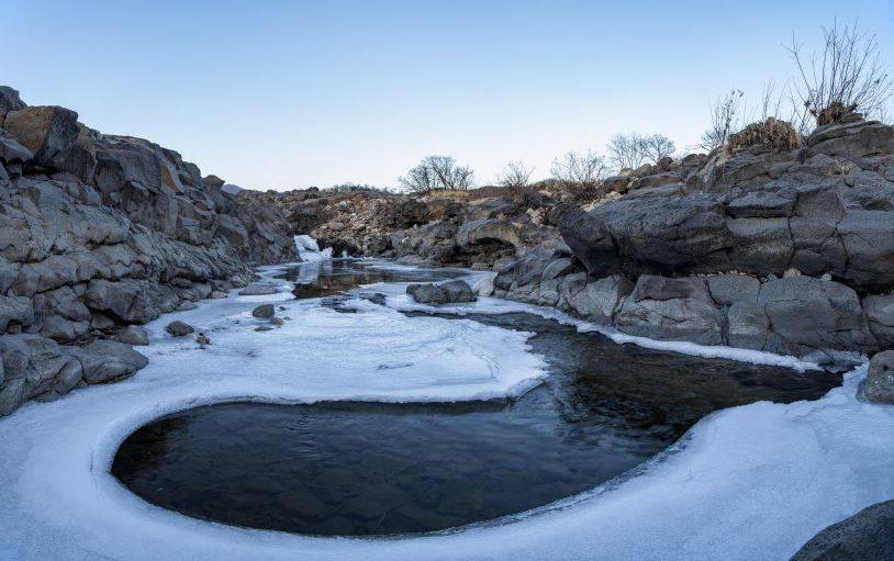 한탄강 8경 중 하나인 교동가마소. 긴 세월 침식과 풍화로 형성된 용암 바위다.