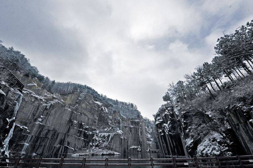 포천아트밸리 천주호 주변에 솟은 화강암 절벽의 설경. /포천시 제공